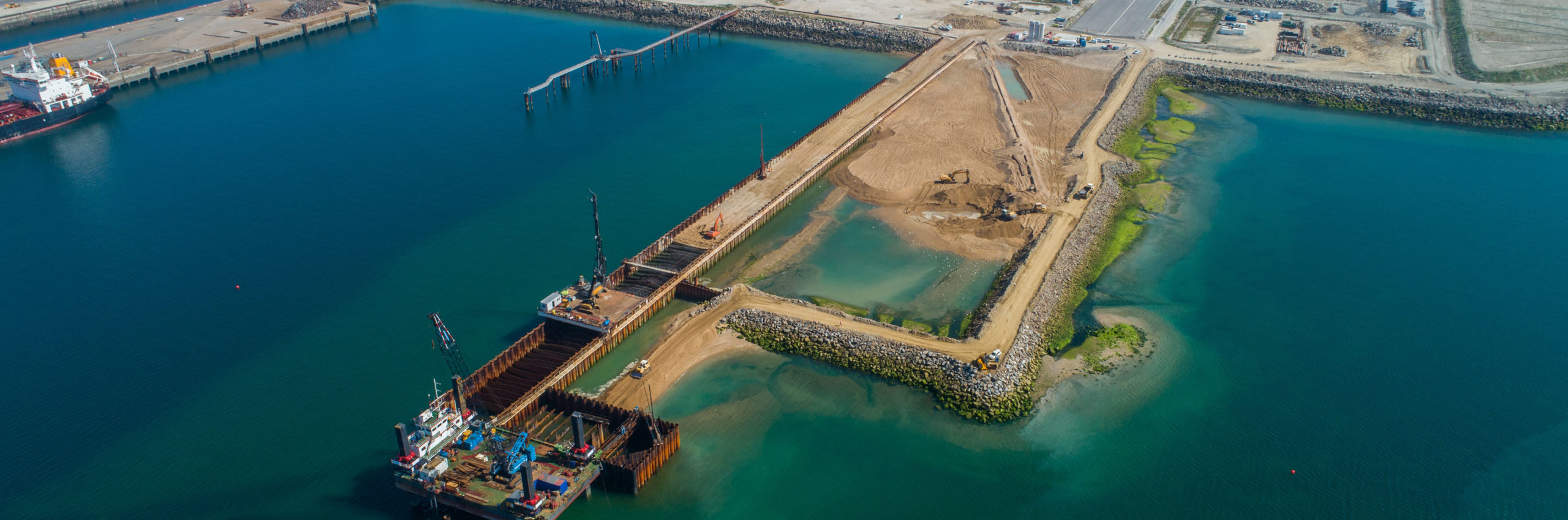 This vast project is organised in two parts: land-based operations to stabilise and develop the existing polder (28 ha) on the one hand, and the completion of the extension over the sea creating a new polder (14 ha) on the other hand. This includes the construction of a 380-m long quay, with a rear platform for unloading dedicated to marine renewable energies (MRE) and an 890-m long arched dam, which will close the “crate” to form the new polder.